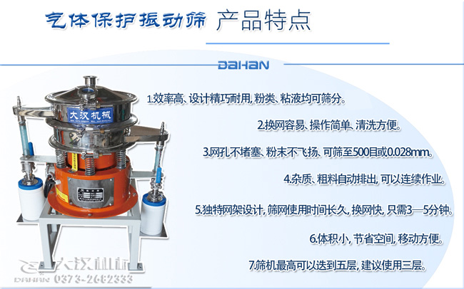 氣體保護篩分機是針對某些物料的特性加裝的,比如有些物料不能接觸氧氣,二氧化碳等等,氣體保護篩分機效率高,設計精巧耐用,網孔不堵塞、粉末不飛揚,雜質、粗料自動排出,可連續作業。效率高、設計精巧耐用,粉類、粘液均可篩分。