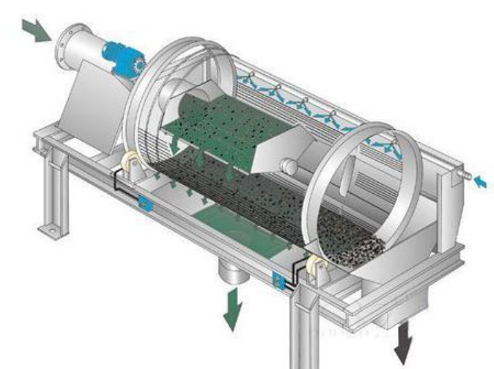 由鏟車上料,通過料斗上安裝的小振動器振動把料漏進滾筒篩沙機,物料進入滾筒后,通過網孔進行物料的分離,成品料會漏下來,經過皮帶機傳送出來,廢料從滾筒尾部漏出。
